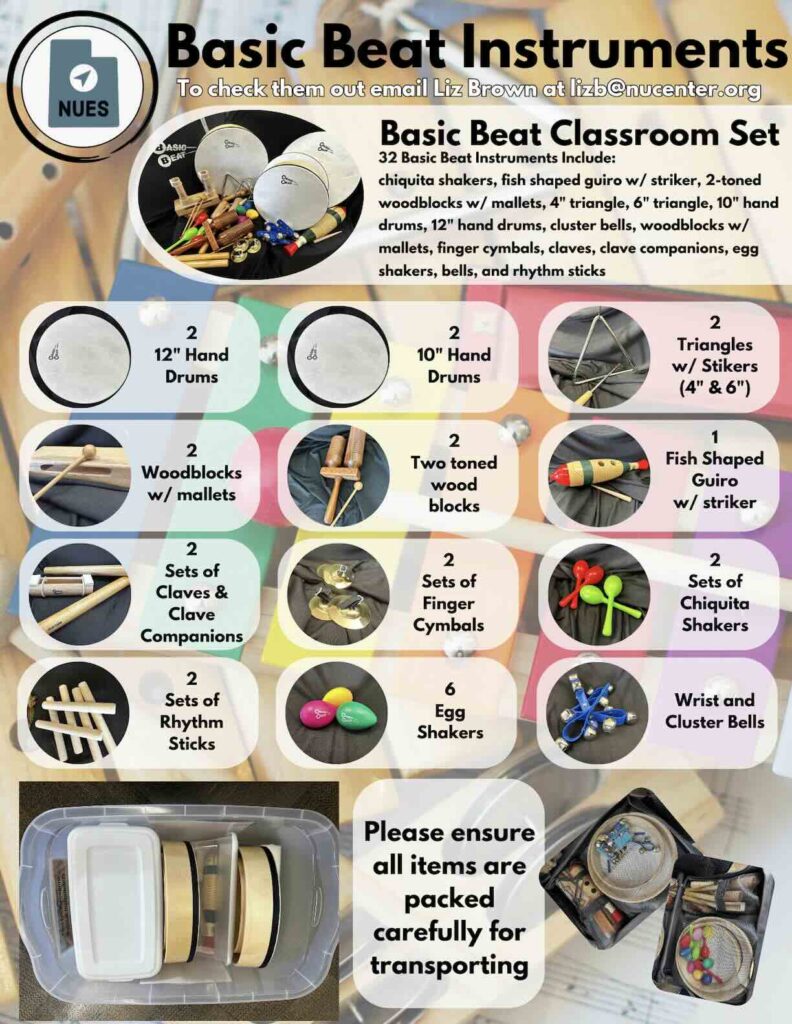 NUES has 4 types of Music Kits available to check out free of charge. Below is a link to fill out in order to check them out.